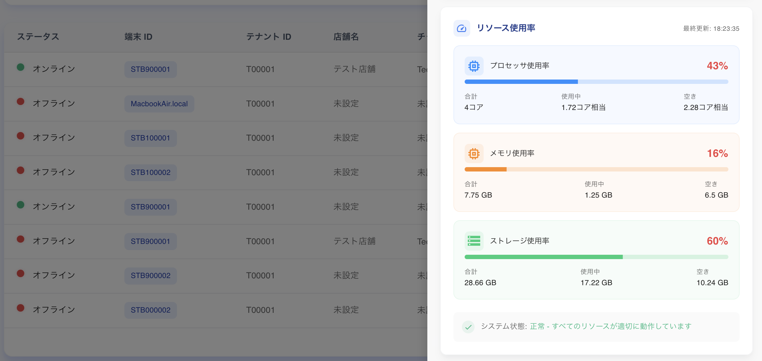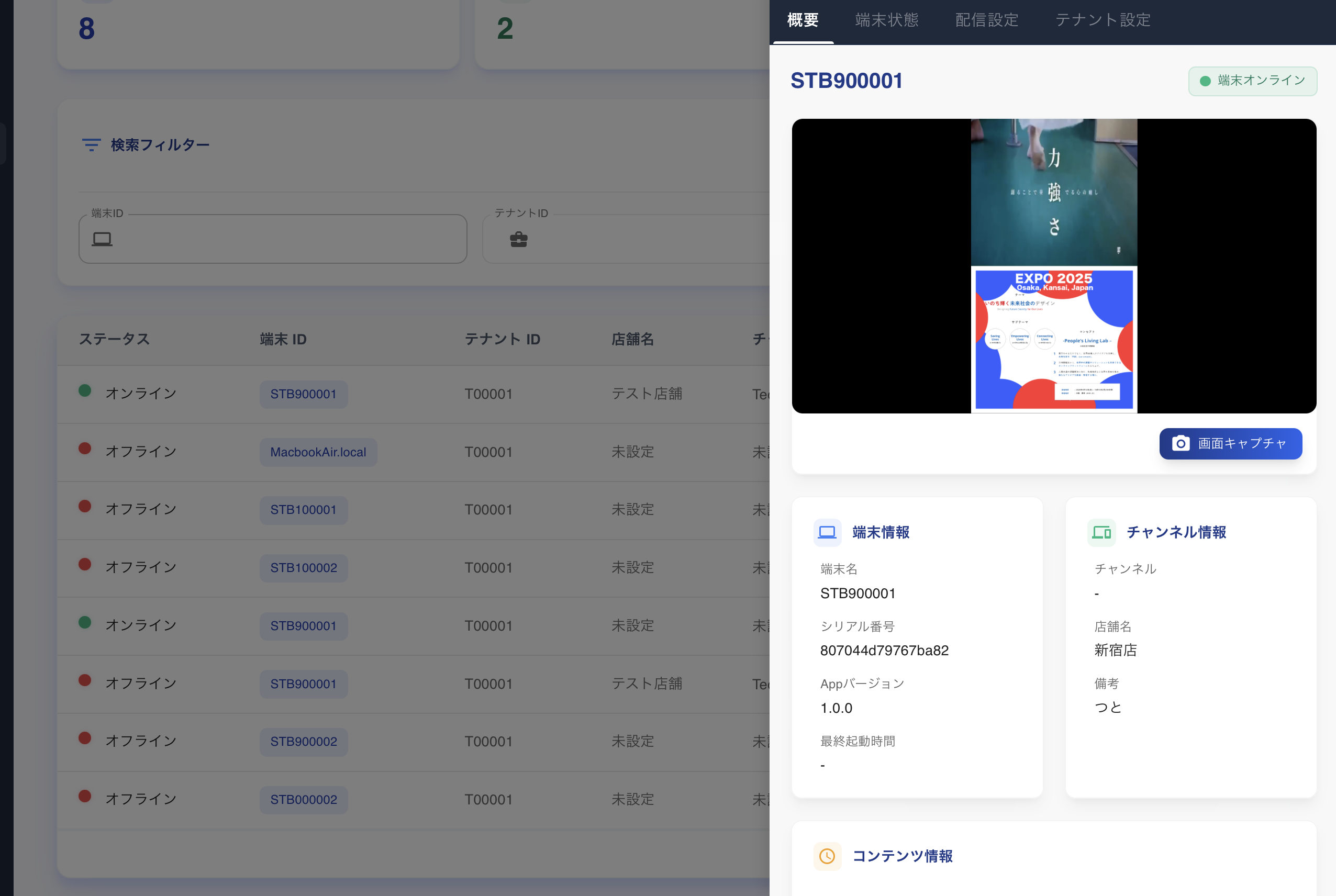 各端末のオンライン状況・再生ステータスをモニタリング。 トラブル発生時も、管理画面から状況を把握し、迅速に対応できます。
